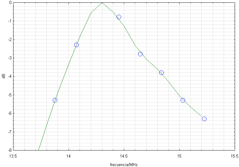 las frecuencias de corte a 3dB son 14000 y 14700kHz, lo que da un Qcargado=20,
