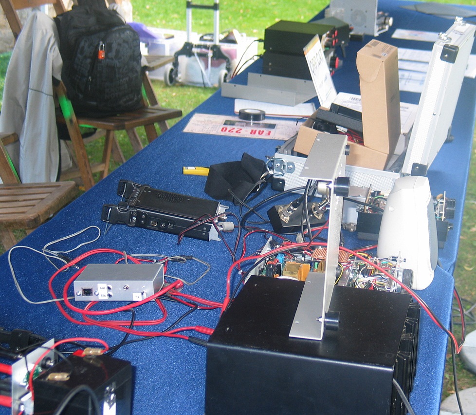 Estat caòtic de la taula barrejant l'estació oerativa amb la demostració d'equips autoconstruits.