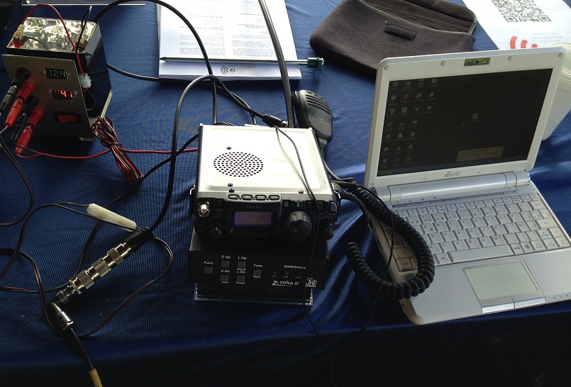 Detall de l'estació d'EA3HLF. FT-817 amb bateria de plom i netbook EeePC.